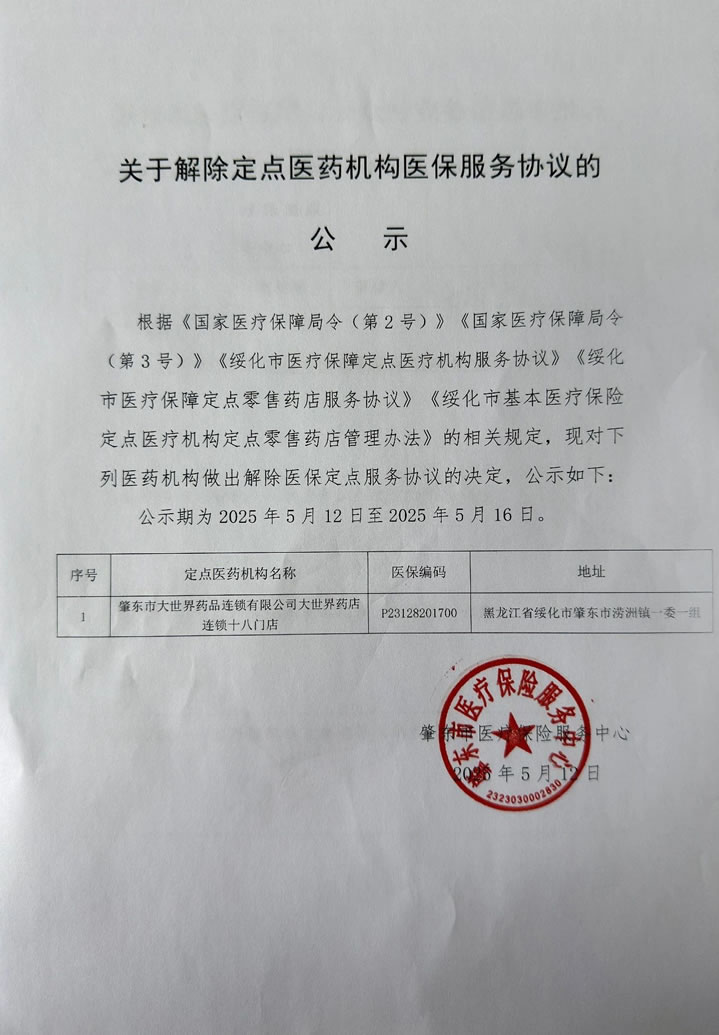 關(guān)于解除定點(diǎn)醫(yī)藥機(jī)構(gòu)醫(yī)保服務(wù)協(xié)議的公示