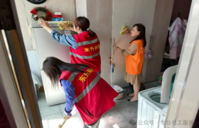 活動(dòng)中,社工站的同志和社區(qū)干部、網(wǎng)格員,明確分工、大家手持抹布、拖把等工具,來到張大娘的家中,對(duì)老人房間內(nèi)的雜物進(jìn)行分類整理,重點(diǎn)擦拭玻璃、清潔地面、整理物品,確保不留衛(wèi)生死角。經(jīng)過數(shù)小時(shí)的辛勤勞動(dòng),張大娘家中環(huán)境煥然一新,為老人們創(chuàng)造了更加舒適、整潔的居住環(huán)境。
