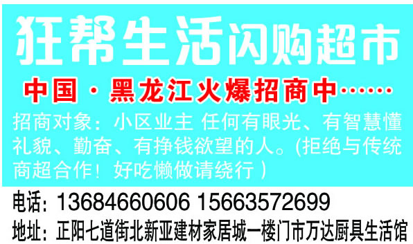 招商對象:小區(qū)業(yè)主 任何有眼光、有智慧懂禮貌、勤奮、有掙錢欲望的人。(拒絕與傳統(tǒng)商超合作!好吃懶做請繞行)